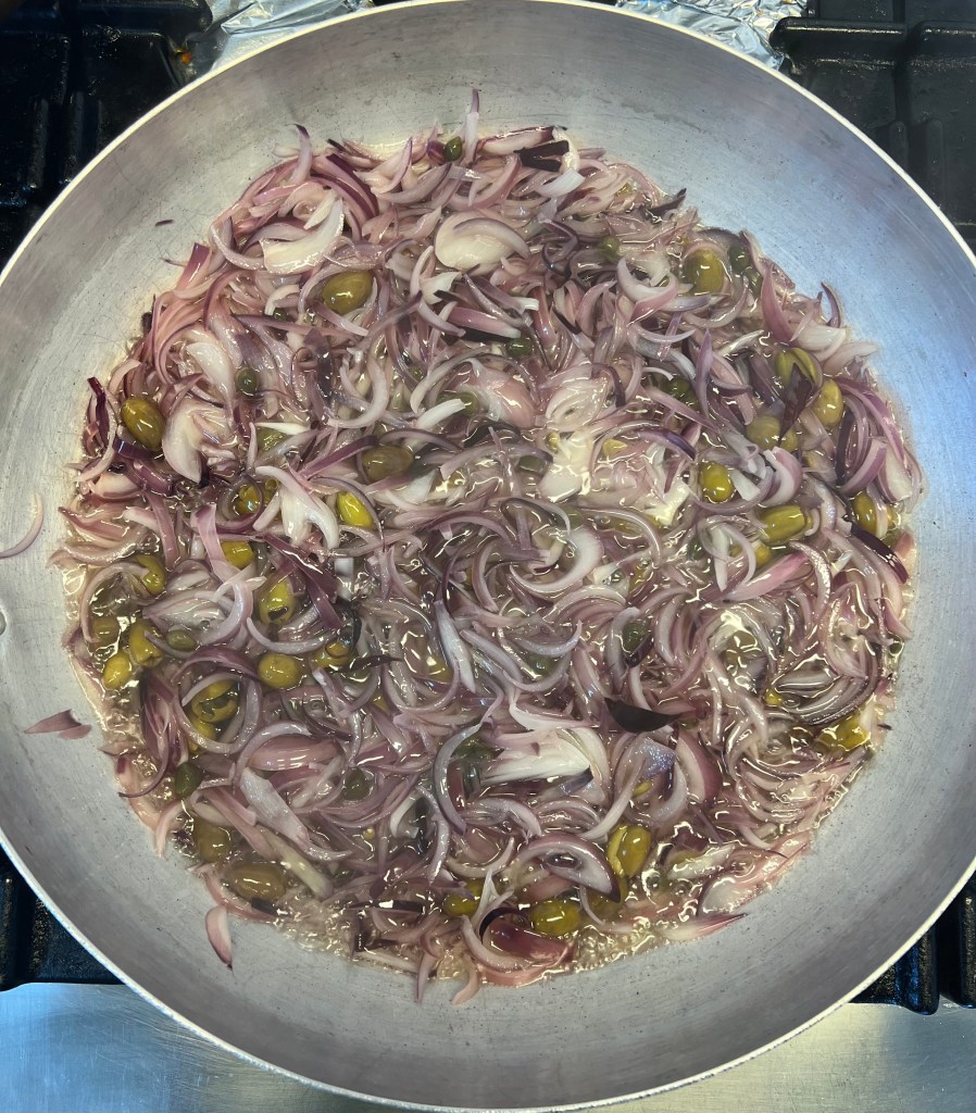 Ahora, lo más importante de la Caponata y el paso que todas las recetas siguen es “se fríe todo por separado”. Si, va todo frito, dije que era un plato tradicional, no uno sano. Entonces, primero vamos a poner aceite de girasol en una sartén y vamos a freír la cebolla junto con las aceitunas y las alcaparras. ¿Por qué esto se fríe junto, si dije que todo se fríe por separado? No hay por qué.