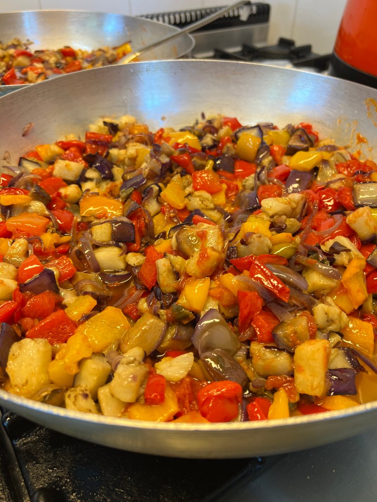 ¿Qué pasa si la queremos hacer en casa? Obviamente no vamos a prepararla como para 20 personas, a menos que queramos stockear todo el freezer, claro. Así que en este caso, vamos a hacerla con solo 2 berenjenas, 1 ½ morron rojo, 1 ½ morron amarillo, 1 cebolla grande, 5 aceitunas, 2 o 3 alcaparras, una cucharada de salsa de tomate, una cucharadita de azucar y solo un chorrito de vinagre.