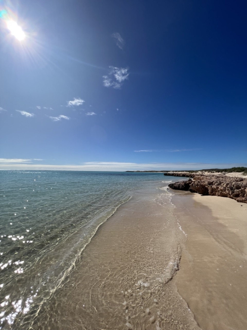 Ubicada dentro del parque nacional Cape Range, está un poco más alejada que otras playas, lo que la convierte en un lugar menos concurrido y más tranquilo, ideal para familias o para quienes solo buscan relajarse en un día de calma junto al mar.